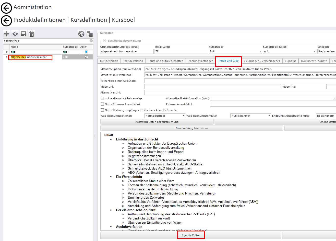 4) Klicken Sie unten auf den Button "Agenda Editor".